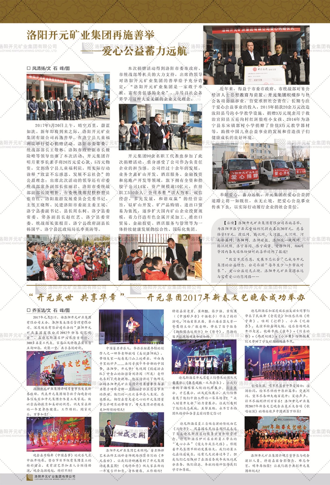 洛陽開元礦業(yè)集團有限公司簡介洛陽開元礦業(yè)集團有限公司,始成立于2006年,位于洛陽市開元大道269號。集團旗下共有十余家全資子公司,業(yè)務涉及有色金屬礦山開發(fā)、礦產品購銷與進出口貿易、房地產開發(fā)、文化藝術、企業(yè)管理與咨詢、資本投資等多個領域。民建河南省委委員、民建河南省委企業(yè)委副主任、民建洛陽市委委員、企業(yè)委主任、洛陽民建企業(yè)家協會會長許明月是公司創(chuàng)始人,現任洛陽開元礦業(yè)集團有限公司董事長。在礦業(yè)領域,洛陽開元礦業(yè)集團擁有多家實力雄厚的子公司:貴州開元礦業(yè)有限公司探、采礦權面積共11.33平方公里;興??h銅鑫礦業(yè)有限公司探礦權面積8.76平方公里,礦山資源潛力巨大;2021年,開元集團與盧氏中科礦業(yè)有限公司開展戰(zhàn)略合作。盧氏中科礦業(yè)有限公司專注于有色金屬的浮選、加工和銷售,擁有強大的技術支撐平臺,是集探、采、選、冶、研為一體的中大型綜合礦業(yè)企業(yè)。目前,盧氏中科王家河1000噸選礦廠已成功投產,雙河金礦、柳關欒盧鉛鋅礦相繼順利開工,樓房銀礦與圪老灣鉛鋅礦的深部探礦重大突破,標志著礦山版圖取得重大進展,為開元集團后續(xù)發(fā)展奠定了堅實基礎。在文化傳媒領域,洛陽市明月美術館通過豐富多樣的藝術展覽、學術研討和公共教育活動,努力打造一個集展覽、交流、教育、研究為一體的綜合性藝術平臺。此外,在金融投資領域,開元集團旗下的北京明峰資本管理有限公司專注于投資具有高增長潛力的優(yōu)秀企業(yè),特別是高科技、新能源、環(huán)保等新興產業(yè),為客戶提供個性化的資產配置服務。在做好企業(yè)經營的同時,開元集團始終不忘企業(yè)的社會責任和家國情懷,以突出的愛心公益事跡,開展了一系列公益慈善活動:“民建林”公益事業(yè)通過“思源基金”“幫幫公益”線上公益平臺,與眾多愛心人士籌措資金20余萬元;資助541名貧困大學生共計270余萬元,推進“數字助力——河南AI人才培養(yǎng)”;捐款10萬元,馳援京津冀、黑龍江洪水地質災害……公司于2017年底被洛陽市慈善總會評為“洛陽慈善風云榜——十大愛心集體”。洛陽開元礦業(yè)集團有限公司秉承持續(xù)發(fā)展理念,憑借多年來良好的企業(yè)信譽與經營業(yè)績,與全國多家企業(yè)建立了良好合作關系,受到社會各界的一致好評,多次榮獲“納稅標兵”“先進企業(yè)”“招商引資模范企業(yè)”等榮譽稱號?;赝麃頃r路,開元人勠力同心,以“闖”的精神和“創(chuàng)”的勁頭,一路披荊斬棘,踏過千山萬水;展望新未來,開元人凝心聚力,不執(zhí)于“舊”,無畏于“新”,秉承“勇于跨越,追求卓越”的企業(yè)精神,乘著國家高質量發(fā)展新征程的東風,跨過高山,越過大海,向著集團多元化、國際化的目標,逐夢遠航,跨越前行!