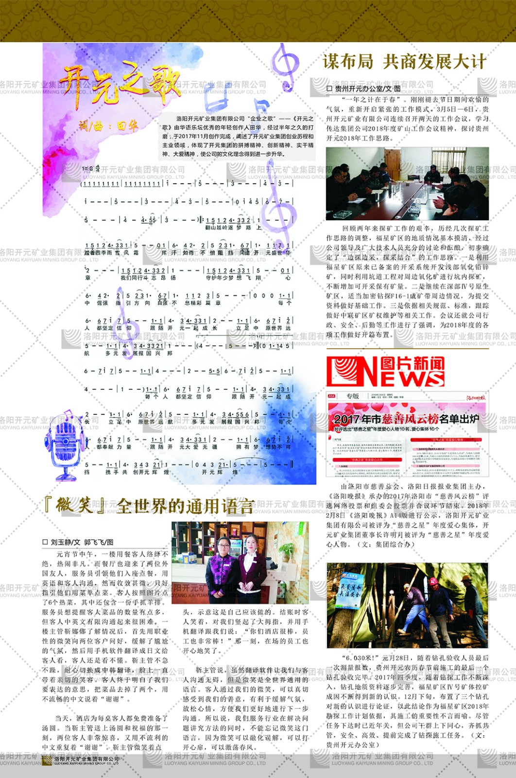 洛陽(yáng)開(kāi)元礦業(yè)集團(tuán)有限公司簡(jiǎn)介洛陽(yáng)開(kāi)元礦業(yè)集團(tuán)有限公司,始成立于2006年,位于洛陽(yáng)市開(kāi)元大道269號(hào)。集團(tuán)旗下共有十余家全資子公司,業(yè)務(wù)涉及有色金屬礦山開(kāi)發(fā)、礦產(chǎn)品購(gòu)銷與進(jìn)出口貿(mào)易、房地產(chǎn)開(kāi)發(fā)、文化藝術(shù)、企業(yè)管理與咨詢、資本投資等多個(gè)領(lǐng)域。民建河南省委委員、民建河南省委企業(yè)委副主任、民建洛陽(yáng)市委委員、企業(yè)委主任、洛陽(yáng)民建企業(yè)家協(xié)會(huì)會(huì)長(zhǎng)許明月是公司創(chuàng)始人,現(xiàn)任洛陽(yáng)開(kāi)元礦業(yè)集團(tuán)有限公司董事長(zhǎng)。在礦業(yè)領(lǐng)域,洛陽(yáng)開(kāi)元礦業(yè)集團(tuán)擁有多家實(shí)力雄厚的子公司:貴州開(kāi)元礦業(yè)有限公司探、采礦權(quán)面積共11.33平方公里;興海縣銅鑫礦業(yè)有限公司探礦權(quán)面積8.76平方公里,礦山資源潛力巨大;2021年,開(kāi)元集團(tuán)與盧氏中科礦業(yè)有限公司開(kāi)展戰(zhàn)略合作。盧氏中科礦業(yè)有限公司專注于有色金屬的浮選、加工和銷售,擁有強(qiáng)大的技術(shù)支撐平臺(tái),是集探、采、選、冶、研為一體的中大型綜合礦業(yè)企業(yè)。目前,盧氏中科王家河1000噸選礦廠已成功投產(chǎn),雙河金礦、柳關(guān)欒盧鉛鋅礦相繼順利開(kāi)工,樓房銀礦與圪老灣鉛鋅礦的深部探礦重大突破,標(biāo)志著礦山版圖取得重大進(jìn)展,為開(kāi)元集團(tuán)后續(xù)發(fā)展奠定了堅(jiān)實(shí)基礎(chǔ)。在文化傳媒領(lǐng)域,洛陽(yáng)市明月美術(shù)館通過(guò)豐富多樣的藝術(shù)展覽、學(xué)術(shù)研討和公共教育活動(dòng),努力打造一個(gè)集展覽、交流、教育、研究為一體的綜合性藝術(shù)平臺(tái)。此外,在金融投資領(lǐng)域,開(kāi)元集團(tuán)旗下的北京明峰資本管理有限公司專注于投資具有高增長(zhǎng)潛力的優(yōu)秀企業(yè),特別是高科技、新能源、環(huán)保等新興產(chǎn)業(yè),為客戶提供個(gè)性化的資產(chǎn)配置服務(wù)。在做好企業(yè)經(jīng)營(yíng)的同時(shí),開(kāi)元集團(tuán)始終不忘企業(yè)的社會(huì)責(zé)任和家國(guó)情懷,以突出的愛(ài)心公益事跡,開(kāi)展了一系列公益慈善活動(dòng):“民建林”公益事業(yè)通過(guò)“思源基金”“幫幫公益”線上公益平臺(tái),與眾多愛(ài)心人士籌措資金20余萬(wàn)元;資助541名貧困大學(xué)生共計(jì)270余萬(wàn)元,推進(jìn)“數(shù)字助力——河南AI人才培養(yǎng)”;捐款10萬(wàn)元,馳援京津冀、黑龍江洪水地質(zhì)災(zāi)害……公司于2017年底被洛陽(yáng)市慈善總會(huì)評(píng)為“洛陽(yáng)慈善風(fēng)云榜——十大愛(ài)心集體”。洛陽(yáng)開(kāi)元礦業(yè)集團(tuán)有限公司秉承持續(xù)發(fā)展理念,憑借多年來(lái)良好的企業(yè)信譽(yù)與經(jīng)營(yíng)業(yè)績(jī),與全國(guó)多家企業(yè)建立了良好合作關(guān)系,受到社會(huì)各界的一致好評(píng),多次榮獲“納稅標(biāo)兵”“先進(jìn)企業(yè)”“招商引資模范企業(yè)”等榮譽(yù)稱號(hào)?;赝麃?lái)時(shí)路,開(kāi)元人勠力同心,以“闖”的精神和“創(chuàng)”的勁頭,一路披荊斬棘,踏過(guò)千山萬(wàn)水;展望新未來(lái),開(kāi)元人凝心聚力,不執(zhí)于“舊”,無(wú)畏于“新”,秉承“勇于跨越,追求卓越”的企業(yè)精神,乘著國(guó)家高質(zhì)量發(fā)展新征程的東風(fēng),跨過(guò)高山,越過(guò)大海,向著集團(tuán)多元化、國(guó)際化的目標(biāo),逐夢(mèng)遠(yuǎn)航,跨越前行!