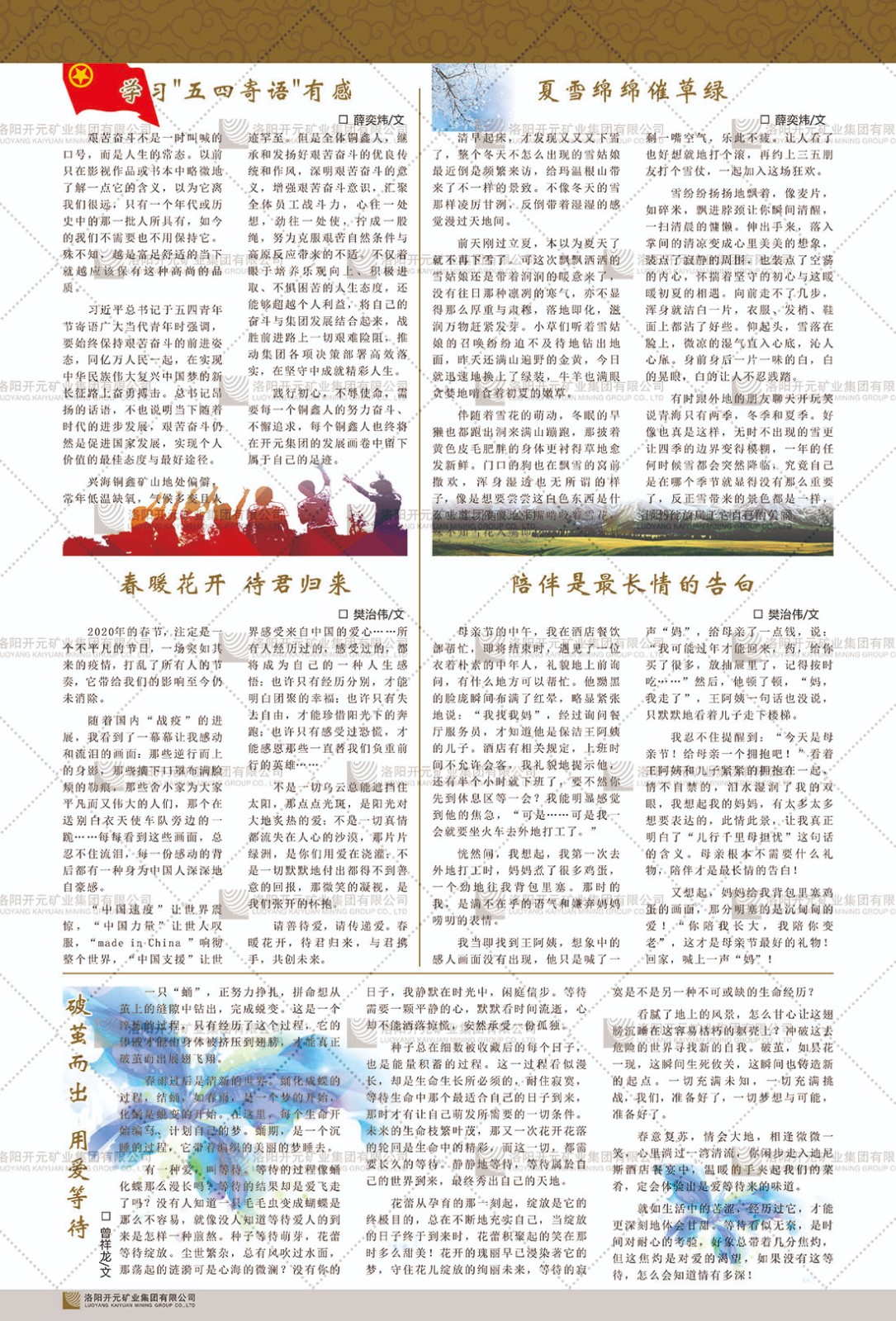 洛陽(yáng)開(kāi)元礦業(yè)集團(tuán)有限公司簡(jiǎn)介洛陽(yáng)開(kāi)元礦業(yè)集團(tuán)有限公司,始成立于2006年,位于洛陽(yáng)市開(kāi)元大道269號(hào)。集團(tuán)旗下共有十余家全資子公司,業(yè)務(wù)涉及有色金屬礦山開(kāi)發(fā)、礦產(chǎn)品購(gòu)銷與進(jìn)出口貿(mào)易、房地產(chǎn)開(kāi)發(fā)、文化藝術(shù)、企業(yè)管理與咨詢、資本投資等多個(gè)領(lǐng)域。民建河南省委委員、民建河南省委企業(yè)委副主任、民建洛陽(yáng)市委委員、企業(yè)委主任、洛陽(yáng)民建企業(yè)家協(xié)會(huì)會(huì)長(zhǎng)許明月是公司創(chuàng)始人,現(xiàn)任洛陽(yáng)開(kāi)元礦業(yè)集團(tuán)有限公司董事長(zhǎng)。在礦業(yè)領(lǐng)域,洛陽(yáng)開(kāi)元礦業(yè)集團(tuán)擁有多家實(shí)力雄厚的子公司:貴州開(kāi)元礦業(yè)有限公司探、采礦權(quán)面積共11.33平方公里;興??h銅鑫礦業(yè)有限公司探礦權(quán)面積8.76平方公里,礦山資源潛力巨大;2021年,開(kāi)元集團(tuán)與盧氏中科礦業(yè)有限公司開(kāi)展戰(zhàn)略合作。盧氏中科礦業(yè)有限公司專注于有色金屬的浮選、加工和銷售,擁有強(qiáng)大的技術(shù)支撐平臺(tái),是集探、采、選、冶、研為一體的中大型綜合礦業(yè)企業(yè)。目前,盧氏中科王家河1000噸選礦廠已成功投產(chǎn),雙河金礦、柳關(guān)欒盧鉛鋅礦相繼順利開(kāi)工,樓房銀礦與圪老灣鉛鋅礦的深部探礦重大突破,標(biāo)志著礦山版圖取得重大進(jìn)展,為開(kāi)元集團(tuán)后續(xù)發(fā)展奠定了堅(jiān)實(shí)基礎(chǔ)。在文化傳媒領(lǐng)域,洛陽(yáng)市明月美術(shù)館通過(guò)豐富多樣的藝術(shù)展覽、學(xué)術(shù)研討和公共教育活動(dòng),努力打造一個(gè)集展覽、交流、教育、研究為一體的綜合性藝術(shù)平臺(tái)。此外,在金融投資領(lǐng)域,開(kāi)元集團(tuán)旗下的北京明峰資本管理有限公司專注于投資具有高增長(zhǎng)潛力的優(yōu)秀企業(yè),特別是高科技、新能源、環(huán)保等新興產(chǎn)業(yè),為客戶提供個(gè)性化的資產(chǎn)配置服務(wù)。在做好企業(yè)經(jīng)營(yíng)的同時(shí),開(kāi)元集團(tuán)始終不忘企業(yè)的社會(huì)責(zé)任和家國(guó)情懷,以突出的愛(ài)心公益事跡,開(kāi)展了一系列公益慈善活動(dòng):“民建林”公益事業(yè)通過(guò)“思源基金”“幫幫公益”線上公益平臺(tái),與眾多愛(ài)心人士籌措資金20余萬(wàn)元;資助541名貧困大學(xué)生共計(jì)270余萬(wàn)元,推進(jìn)“數(shù)字助力——河南AI人才培養(yǎng)”;捐款10萬(wàn)元,馳援京津冀、黑龍江洪水地質(zhì)災(zāi)害……公司于2017年底被洛陽(yáng)市慈善總會(huì)評(píng)為“洛陽(yáng)慈善風(fēng)云榜——十大愛(ài)心集體”。洛陽(yáng)開(kāi)元礦業(yè)集團(tuán)有限公司秉承持續(xù)發(fā)展理念,憑借多年來(lái)良好的企業(yè)信譽(yù)與經(jīng)營(yíng)業(yè)績(jī),與全國(guó)多家企業(yè)建立了良好合作關(guān)系,受到社會(huì)各界的一致好評(píng),多次榮獲“納稅標(biāo)兵”“先進(jìn)企業(yè)”“招商引資模范企業(yè)”等榮譽(yù)稱號(hào)?;赝麃?lái)時(shí)路,開(kāi)元人勠力同心,以“闖”的精神和“創(chuàng)”的勁頭,一路披荊斬棘,踏過(guò)千山萬(wàn)水;展望新未來(lái),開(kāi)元人凝心聚力,不執(zhí)于“舊”,無(wú)畏于“新”,秉承“勇于跨越,追求卓越”的企業(yè)精神,乘著國(guó)家高質(zhì)量發(fā)展新征程的東風(fēng),跨過(guò)高山,越過(guò)大海,向著集團(tuán)多元化、國(guó)際化的目標(biāo),逐夢(mèng)遠(yuǎn)航,跨越前行!