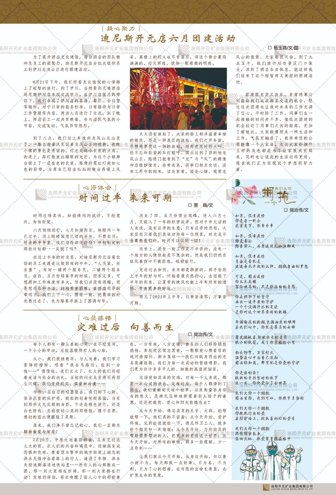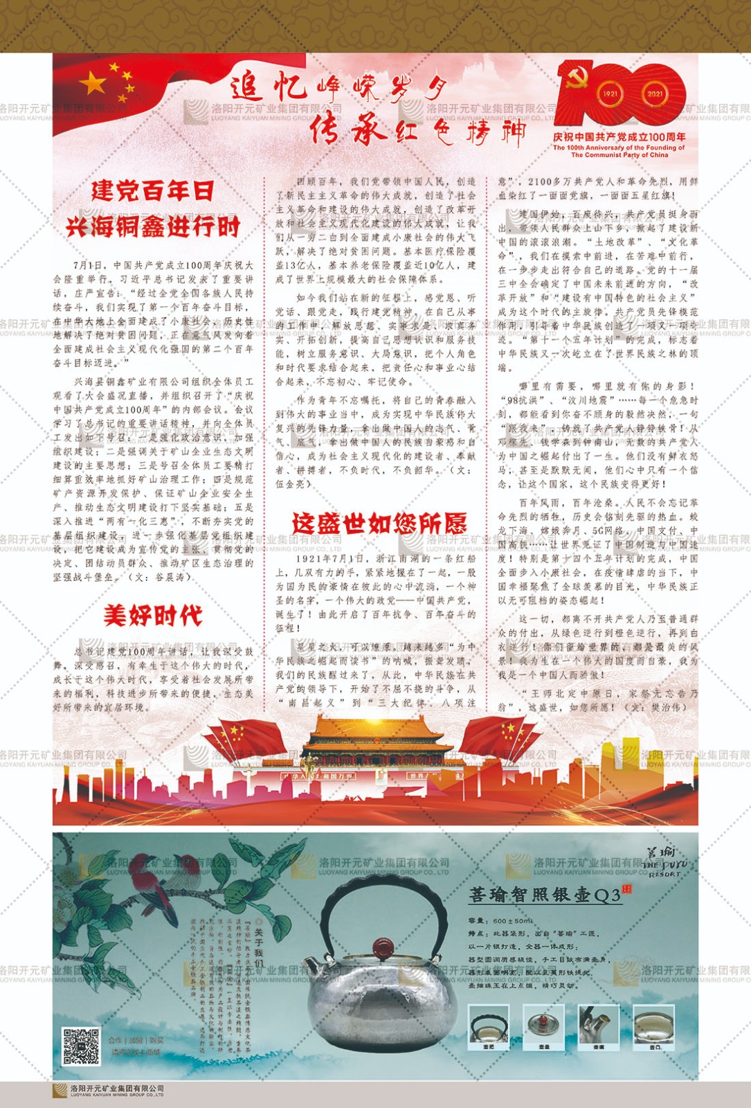 洛陽開元礦業(yè)集團有限公司簡介洛陽開元礦業(yè)集團有限公司,始成立于2006年,位于洛陽市開元大道269號。集團旗下共有十余家全資子公司,業(yè)務涉及有色金屬礦山開發(fā)、礦產品購銷與進出口貿易、房地產開發(fā)、文化藝術、企業(yè)管理與咨詢、資本投資等多個領域。民建河南省委委員、民建河南省委企業(yè)委副主任、民建洛陽市委委員、企業(yè)委主任、洛陽民建企業(yè)家協(xié)會會長許明月是公司創(chuàng)始人,現(xiàn)任洛陽開元礦業(yè)集團有限公司董事長。在礦業(yè)領域,洛陽開元礦業(yè)集團擁有多家實力雄厚的子公司:貴州開元礦業(yè)有限公司探、采礦權面積共11.33平方公里;興??h銅鑫礦業(yè)有限公司探礦權面積8.76平方公里,礦山資源潛力巨大;2021年,開元集團與盧氏中科礦業(yè)有限公司開展戰(zhàn)略合作。盧氏中科礦業(yè)有限公司專注于有色金屬的浮選、加工和銷售,擁有強大的技術支撐平臺,是集探、采、選、冶、研為一體的中大型綜合礦業(yè)企業(yè)。目前,盧氏中科王家河1000噸選礦廠已成功投產,雙河金礦、柳關欒盧鉛鋅礦相繼順利開工,樓房銀礦與圪老灣鉛鋅礦的深部探礦重大突破,標志著礦山版圖取得重大進展,為開元集團后續(xù)發(fā)展奠定了堅實基礎。在文化傳媒領域,洛陽市明月美術館通過豐富多樣的藝術展覽、學術研討和公共教育活動,努力打造一個集展覽、交流、教育、研究為一體的綜合性藝術平臺。此外,在金融投資領域,開元集團旗下的北京明峰資本管理有限公司專注于投資具有高增長潛力的優(yōu)秀企業(yè),特別是高科技、新能源、環(huán)保等新興產業(yè),為客戶提供個性化的資產配置服務。在做好企業(yè)經營的同時,開元集團始終不忘企業(yè)的社會責任和家國情懷,以突出的愛心公益事跡,開展了一系列公益慈善活動:“民建林”公益事業(yè)通過“思源基金”“幫幫公益”線上公益平臺,與眾多愛心人士籌措資金20余萬元;資助541名貧困大學生共計270余萬元,推進“數(shù)字助力——河南AI人才培養(yǎng)”;捐款10萬元,馳援京津冀、黑龍江洪水地質災害……公司于2017年底被洛陽市慈善總會評為“洛陽慈善風云榜——十大愛心集體”。洛陽開元礦業(yè)集團有限公司秉承持續(xù)發(fā)展理念,憑借多年來良好的企業(yè)信譽與經營業(yè)績,與全國多家企業(yè)建立了良好合作關系,受到社會各界的一致好評,多次榮獲“納稅標兵”“先進企業(yè)”“招商引資模范企業(yè)”等榮譽稱號?;赝麃頃r路,開元人勠力同心,以“闖”的精神和“創(chuàng)”的勁頭,一路披荊斬棘,踏過千山萬水;展望新未來,開元人凝心聚力,不執(zhí)于“舊”,無畏于“新”,秉承“勇于跨越,追求卓越”的企業(yè)精神,乘著國家高質量發(fā)展新征程的東風,跨過高山,越過大海,向著集團多元化、國際化的目標,逐夢遠航,跨越前行!
