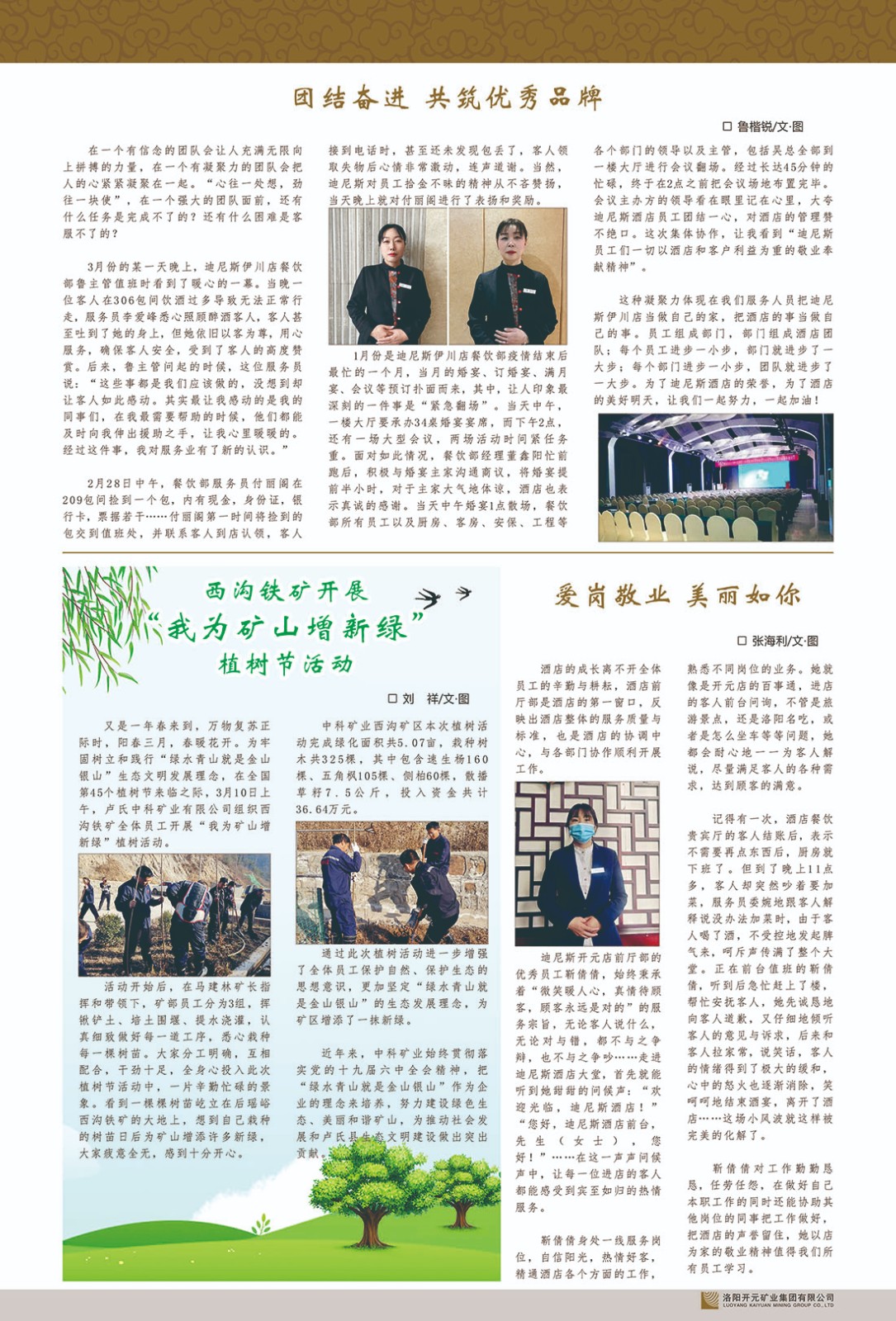 洛陽(yáng)開(kāi)元礦業(yè)集團(tuán)有限公司簡(jiǎn)介洛陽(yáng)開(kāi)元礦業(yè)集團(tuán)有限公司,始成立于2006年,位于洛陽(yáng)市開(kāi)元大道269號(hào)。集團(tuán)旗下共有十余家全資子公司,業(yè)務(wù)涉及有色金屬礦山開(kāi)發(fā)、礦產(chǎn)品購(gòu)銷(xiāo)與進(jìn)出口貿(mào)易、房地產(chǎn)開(kāi)發(fā)、文化藝術(shù)、企業(yè)管理與咨詢(xún)、資本投資等多個(gè)領(lǐng)域。民建河南省委委員、民建河南省委企業(yè)委副主任、民建洛陽(yáng)市委委員、企業(yè)委主任、洛陽(yáng)民建企業(yè)家協(xié)會(huì)會(huì)長(zhǎng)許明月是公司創(chuàng)始人,現(xiàn)任洛陽(yáng)開(kāi)元礦業(yè)集團(tuán)有限公司董事長(zhǎng)。在礦業(yè)領(lǐng)域,洛陽(yáng)開(kāi)元礦業(yè)集團(tuán)擁有多家實(shí)力雄厚的子公司:貴州開(kāi)元礦業(yè)有限公司探、采礦權(quán)面積共11.33平方公里;興??h銅鑫礦業(yè)有限公司探礦權(quán)面積8.76平方公里,礦山資源潛力巨大;2021年,開(kāi)元集團(tuán)與盧氏中科礦業(yè)有限公司開(kāi)展戰(zhàn)略合作。盧氏中科礦業(yè)有限公司專(zhuān)注于有色金屬的浮選、加工和銷(xiāo)售,擁有強(qiáng)大的技術(shù)支撐平臺(tái),是集探、采、選、冶、研為一體的中大型綜合礦業(yè)企業(yè)。目前,盧氏中科王家河1000噸選礦廠(chǎng)已成功投產(chǎn),雙河金礦、柳關(guān)欒盧鉛鋅礦相繼順利開(kāi)工,樓房銀礦與圪老灣鉛鋅礦的深部探礦重大突破,標(biāo)志著礦山版圖取得重大進(jìn)展,為開(kāi)元集團(tuán)后續(xù)發(fā)展奠定了堅(jiān)實(shí)基礎(chǔ)。在文化傳媒領(lǐng)域,洛陽(yáng)市明月美術(shù)館通過(guò)豐富多樣的藝術(shù)展覽、學(xué)術(shù)研討和公共教育活動(dòng),努力打造一個(gè)集展覽、交流、教育、研究為一體的綜合性藝術(shù)平臺(tái)。此外,在金融投資領(lǐng)域,開(kāi)元集團(tuán)旗下的北京明峰資本管理有限公司專(zhuān)注于投資具有高增長(zhǎng)潛力的優(yōu)秀企業(yè),特別是高科技、新能源、環(huán)保等新興產(chǎn)業(yè),為客戶(hù)提供個(gè)性化的資產(chǎn)配置服務(wù)。在做好企業(yè)經(jīng)營(yíng)的同時(shí),開(kāi)元集團(tuán)始終不忘企業(yè)的社會(huì)責(zé)任和家國(guó)情懷,以突出的愛(ài)心公益事跡,開(kāi)展了一系列公益慈善活動(dòng):“民建林”公益事業(yè)通過(guò)“思源基金”“幫幫公益”線(xiàn)上公益平臺(tái),與眾多愛(ài)心人士籌措資金20余萬(wàn)元;資助541名貧困大學(xué)生共計(jì)270余萬(wàn)元,推進(jìn)“數(shù)字助力——河南AI人才培養(yǎng)”;捐款10萬(wàn)元,馳援京津冀、黑龍江洪水地質(zhì)災(zāi)害……公司于2017年底被洛陽(yáng)市慈善總會(huì)評(píng)為“洛陽(yáng)慈善風(fēng)云榜——十大愛(ài)心集體”。洛陽(yáng)開(kāi)元礦業(yè)集團(tuán)有限公司秉承持續(xù)發(fā)展理念,憑借多年來(lái)良好的企業(yè)信譽(yù)與經(jīng)營(yíng)業(yè)績(jī),與全國(guó)多家企業(yè)建立了良好合作關(guān)系,受到社會(huì)各界的一致好評(píng),多次榮獲“納稅標(biāo)兵”“先進(jìn)企業(yè)”“招商引資模范企業(yè)”等榮譽(yù)稱(chēng)號(hào)?;赝麃?lái)時(shí)路,開(kāi)元人勠力同心,以“闖”的精神和“創(chuàng)”的勁頭,一路披荊斬棘,踏過(guò)千山萬(wàn)水;展望新未來(lái),開(kāi)元人凝心聚力,不執(zhí)于“舊”,無(wú)畏于“新”,秉承“勇于跨越,追求卓越”的企業(yè)精神,乘著國(guó)家高質(zhì)量發(fā)展新征程的東風(fēng),跨過(guò)高山,越過(guò)大海,向著集團(tuán)多元化、國(guó)際化的目標(biāo),逐夢(mèng)遠(yuǎn)航,跨越前行!